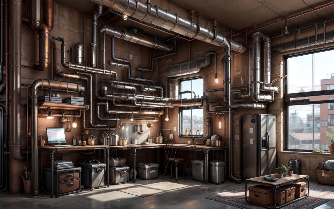 Важно сочетать металлические трубы с деревянными или кирпичными поверхностями, а также использовать нейтральные цвета и простые формы, чтобы подчеркнуть индустриальный стиль и создать гармоничный интерьер.