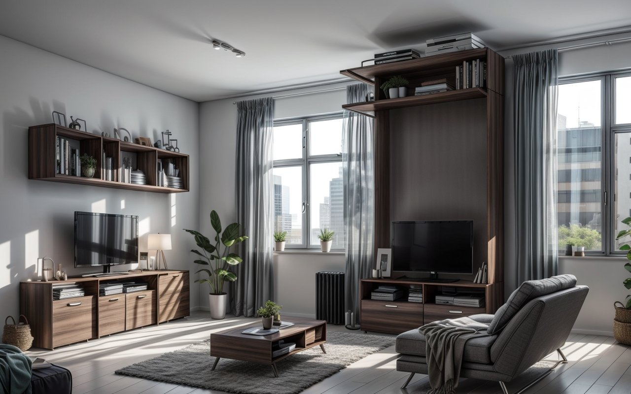 Наиболее эффективными являются трансформируемая мебель, раскладные кровати, компактные стеллажи с встроенными рабочими зонами и мебель с скрытыми отделениями для хранения. Эти типы позволяют максимально использовать доступное пространство без визуального нагромождения.