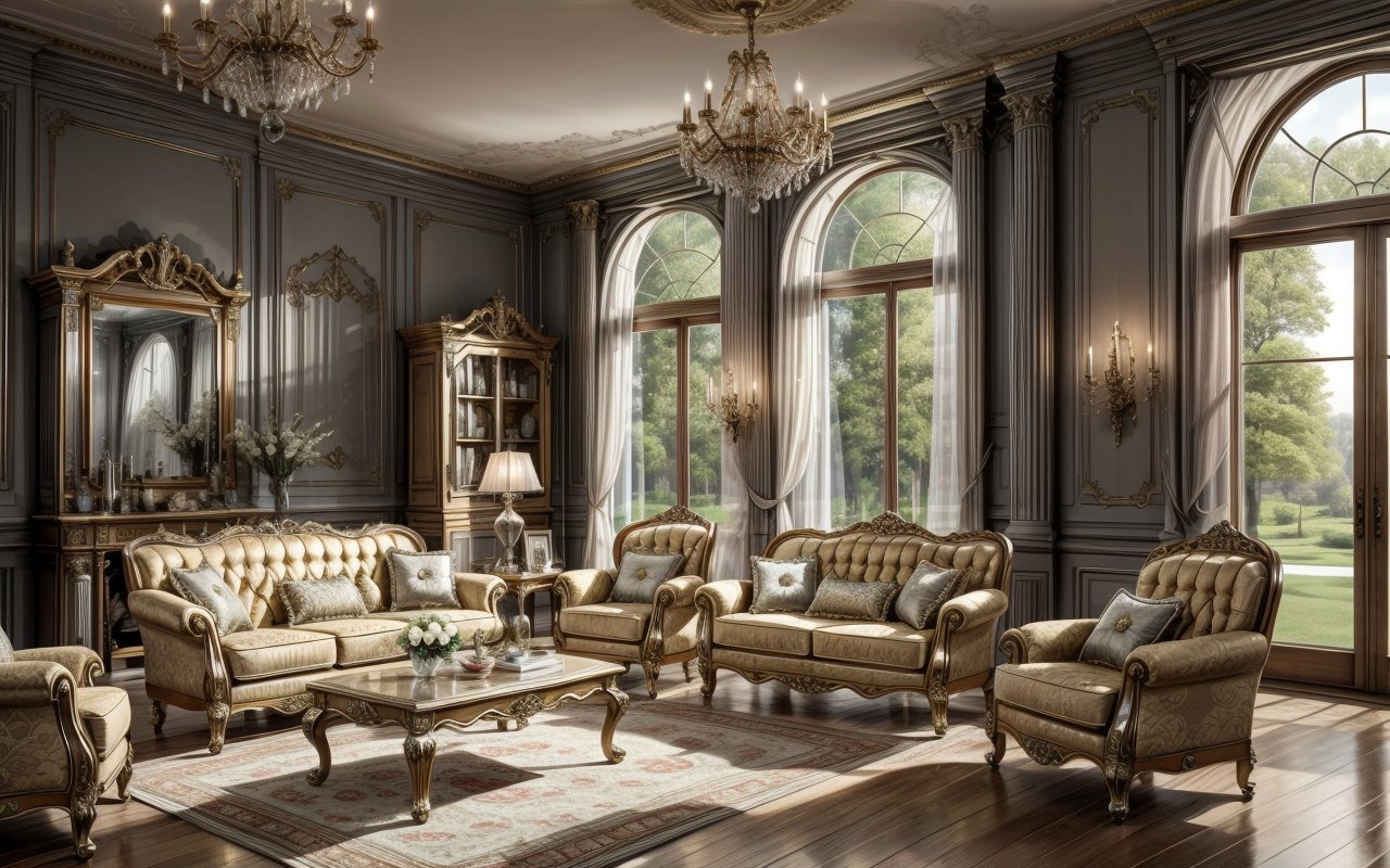 Обилие резных деталей, мягкая обивка, вышитые или тканевые вставки — все это создает ощущение комфорта и изящества. В отделке используют ткани богатых оттенков, иногда с вышивкой.