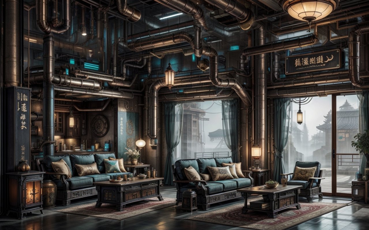 Рекомендуется использовать нейтральные оттенки — серый, черный, коричневый — в сочетании с яркими акцентами, например, красным, золотым или бирюзовым, чтобы подчеркнуть восточные мотивы и сохранить индустриальную строгость.